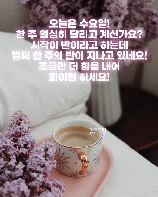 한 주의 절반인 수요일입니다. 오늘하루 하시는 일 모두 술술 풀리시길 바랍니다. 심리적으로 지치기 쉬운 수요일이지만 따뜻한 커피 한잔 하시고 힘차게 즐겁게 보내시길 바랍니다.